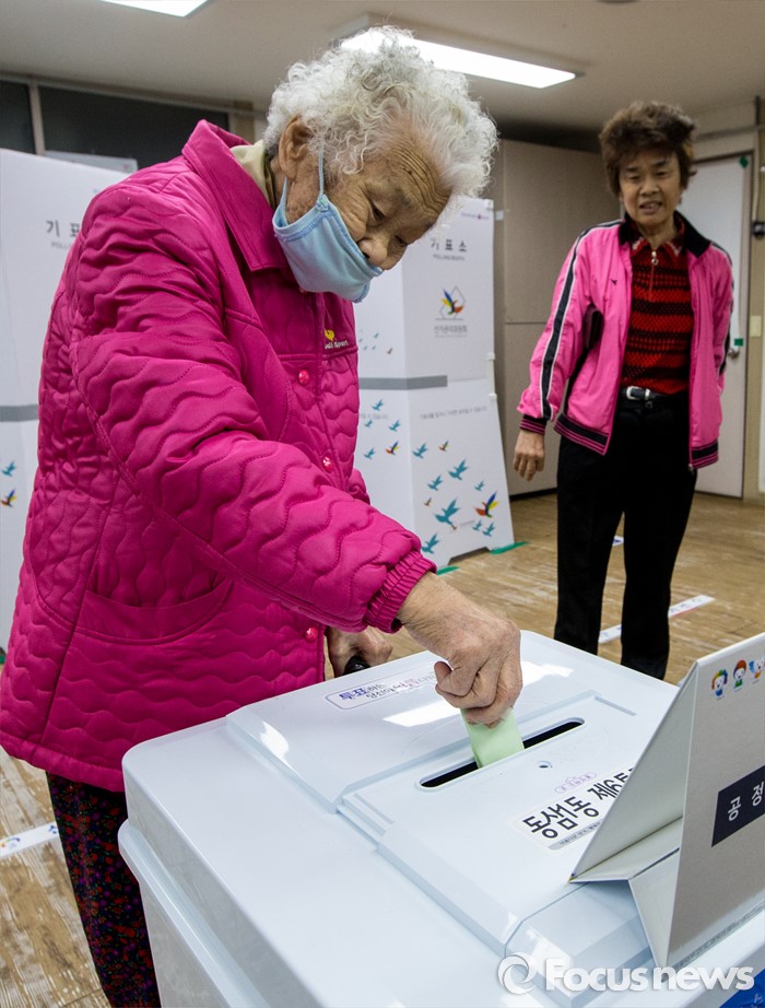 (부산=포커스뉴스) 제20대 국회의원선거일인 13일 오전 부산 영도구 동삼1동 제6투표소에서한 노인이 투표하고 있다.