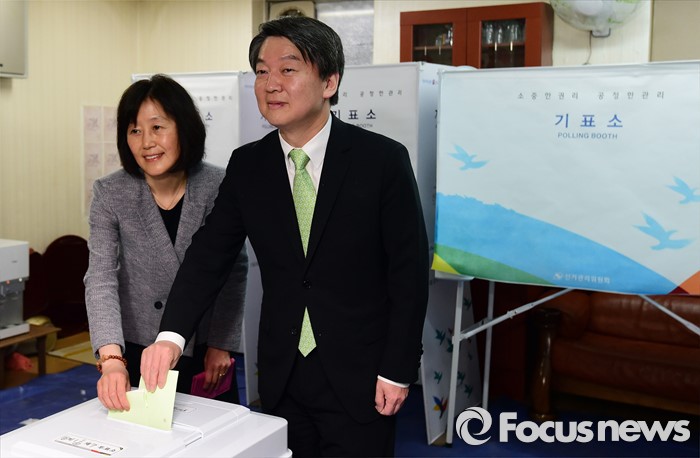 (서울=포커스뉴스) 안철수 국민의당 상임공동대표가 제20대 국회의원선거날인 13일 서울 노원구 상계1동 제7투표소에서 부인 김미경 씨와 투표를 하고 있다.