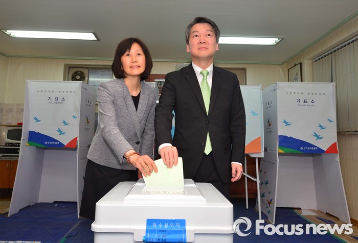 (서울=포커스뉴스) 안철수 국민의당 상임공동대표가 제20대 국회의원선거날인 13일 서울 노원구 상계1동 제7투표소에서 부인 김미경 씨와 투표를 하고 있다.