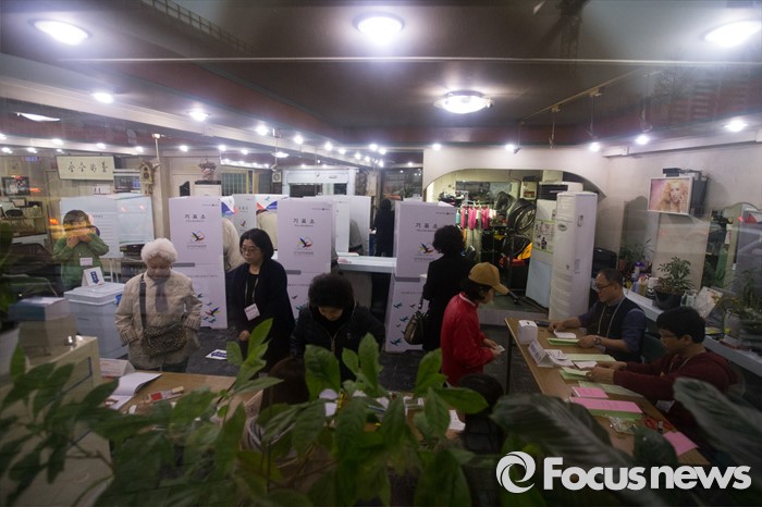 (서울=포커스뉴스) 제20대 국회의원선거일인 13일 오전 서울 서대문구 뉴헤어미용실에 위치한 홍은제2동 제2투표소에서 유권자들이 투표용지를 받기 위한 절차를 밟고 있다.