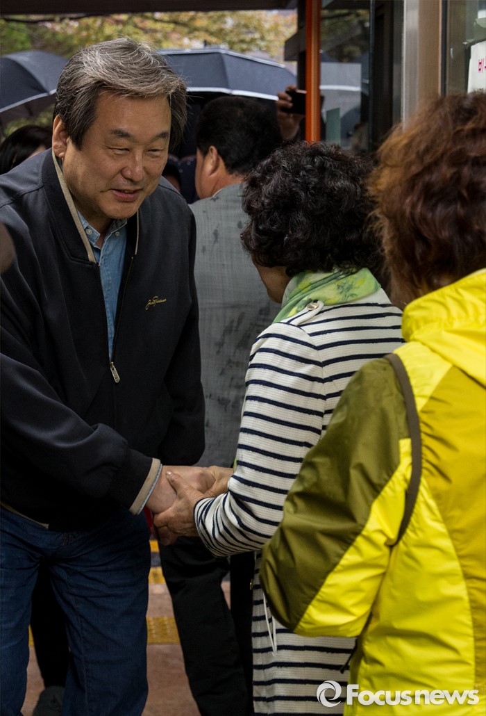(부산=포커스뉴스) 제20대 국회의원선거일인 13일 오전 부산 영도구 동삼1동 제6투표소에서 김무성 새누리당 대표가 유권자들과 악수하고 있다.