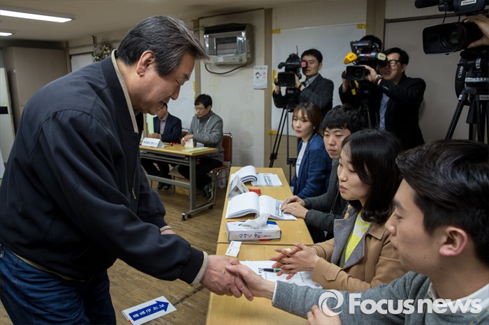 (부산=포커스뉴스) 제20대 국회의원선거일인 13일 오전 부산 영도구 동삼1동 제6투표소에서 김무성 새누리당 대표가 투표사무원들과 악수하고 있다.