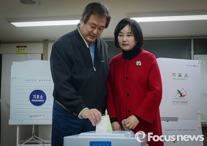 (부산=포커스뉴스) 제20대 국회의원선거일인 13일 오전 부산 영도구 동삼1동 제6투표소에서 김무성 새누리당 대표와 부인 최양옥 씨가 투표하고 있다.