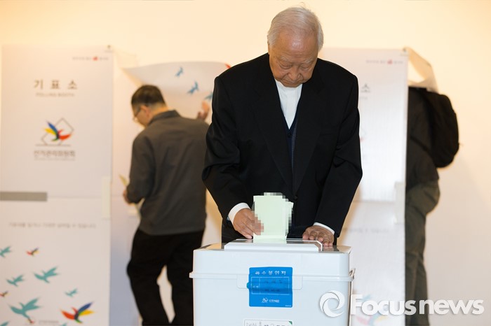 (서울=포커스뉴스) 2016 제20대 국회의원선거날인 13일 오전 서울 종로구 동성고등학교 백주년기념관에 설치된 투표소에서 정진석 추기경이 투표를 하고 있다.