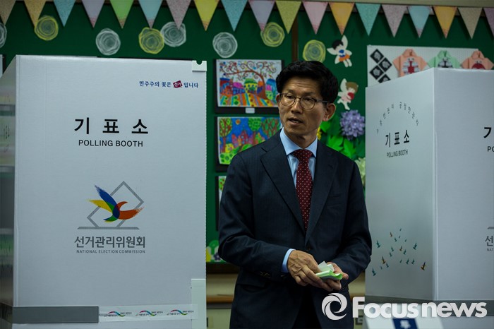 (대구=포커스뉴스) 제20대 국회의원선거날인 13일 오전 대구 수성구 청림초등학교에 마련된 투표소에서 김문수 새누리당 대구 수성구갑 후보가 투표를 하고 있다.