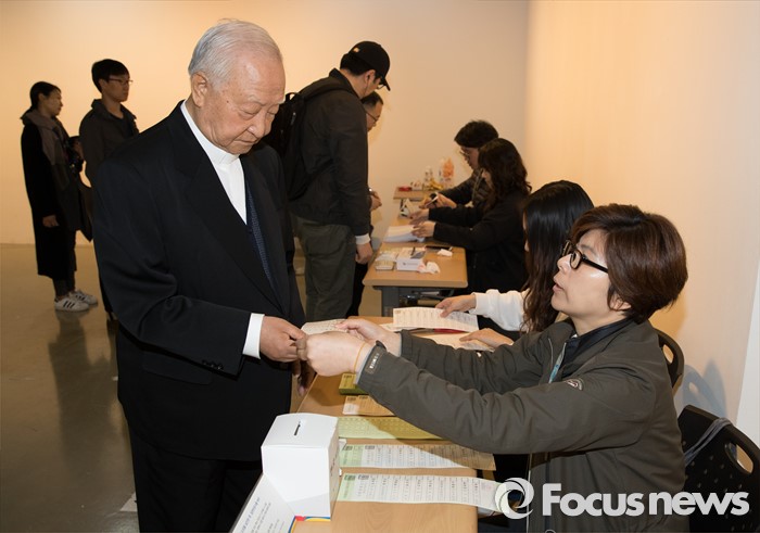 (서울=포커스뉴스) 2016 제20대 국회의원선거날인 13일 오전 서울 종로구 동성고등학교 백주년기념관에 설치된 투표소에서 정진석 추기경이 투표용지를 받고 있다.
