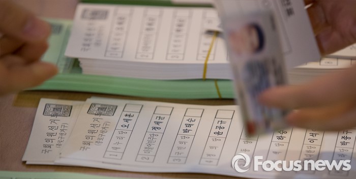 (서울=포커스뉴스) 2016 제20대 국회의원선거날인 13일 오전 서울 종로구 동성고등학교 백주년기념관에 설치된 투표소에서 유권자들이 투표용지를 받고 있다.
