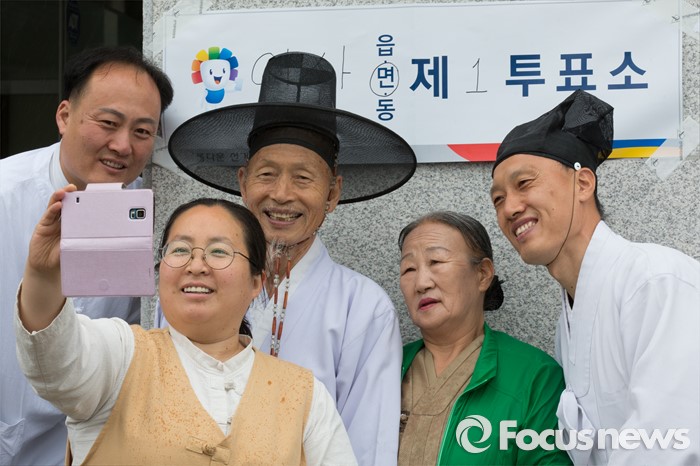 제 20대 총선의 유권자 수는 총 4210만398명이다. 자신의 지역구별 투표장은 선관위 홈페이지를 통해 확인할 수 있다. (선관위 홈페이지-투표장 확인하기)(논산=포커스뉴스) 제20대 국회의원 선거가 시작된 13일 오전 충남 논산 연산면 제1투표소에서 양지서당 유복엽 큰 훈장과 가족들이 투표를 마치고 인증사진을 촬영하고 있다. 2016.04.13 김기태 기자