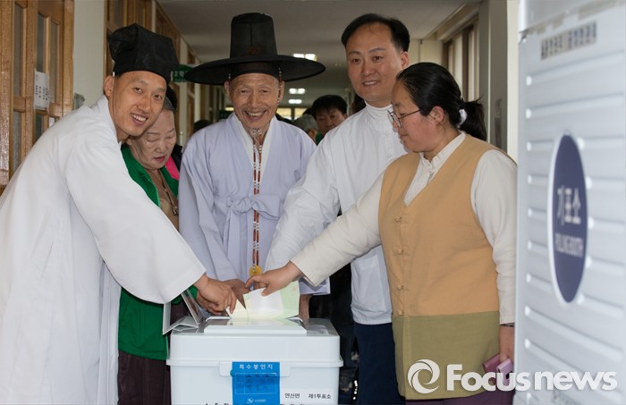 (논산=포커스뉴스) 제20대 국회의원 선거가 시작된 13일 오전 충남 논산 연산면 제1투표소에서 양지서당 유복엽 큰 훈장과 가족들이 투표하고 있다.