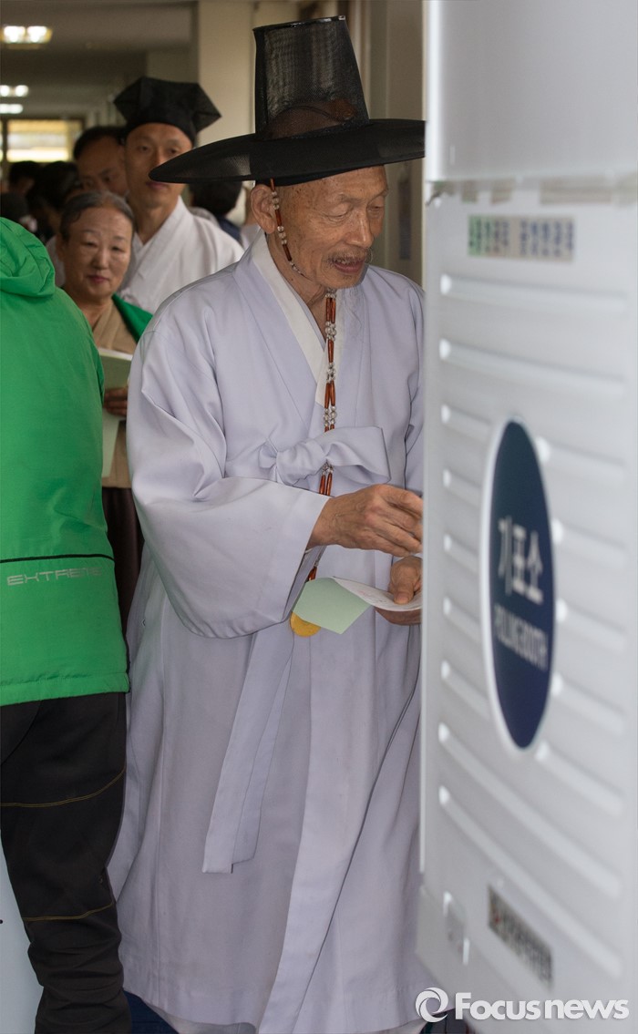 (논산=포커스뉴스) 제20대 국회의원 선거가 시작된 13일 오전 충남 논산 연산면 제1투표소에서 양지서당 유복엽 큰 훈장과 가족들이 투표하고 있다.