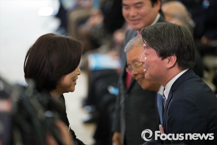 (서울=포커스뉴스) 제20대 국회의원선거일인 13일 오전 서울 용산구 백범기념관에서 열린 대한민국 임시정부 수립 97주년 기념식에 참석한 심상정(왼쪽) 정의당 대표와 안철수 국민의당 공동대표가 인사를 나누고 있다.