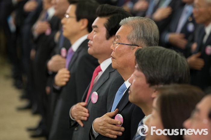 (서울=포커스뉴스) 제20대 국회의원선거일인 13일 오전 서울 용산구 백범기념관에서 열린 대한민국 임시정부 수립 97주년 기념식에 황교안 국무총리, 원유철 새누리당 원내대표, 김종인 더불어민주당 비상대책위 대표, 안철수 국민의당 공동대표, 심상정 정의당 국민의례를 하고 있다.