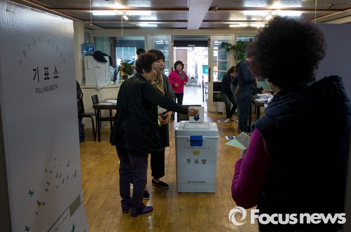 (부산=포커스뉴스) 제20대 국회의원선거일인 13일 오전 부산 사하구 하단1동 제1투표소에서 유권자들이 투표하고 있다. 이 투표소는 하단전통시장 내 한 밀면 음식점에 마련됐다.