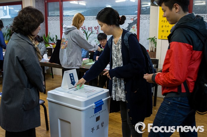 (부산=포커스뉴스) 제20대 국회의원선거일인 13일 오전 부산 사하구 하단1동 제1투표소에서 유권자들이 투표하고 있다. 이 투표소는 하단전통시장 내 한 밀면 음식점에 마련됐다.