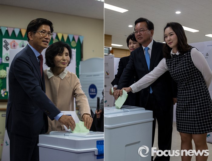 대구 수성갑에서 초접전을 벌이고 있는 김문수 새누리당 후보와 김부겸 더민주 후보는 이날 오전 일찍 가족과 함께 투표를 했다. 이번 총선 결과가 향후 두 사람의 정치 인생에 변곡점이 될 가능성이 높아, 이들의 투표 모습을 담으려는 취재진들의 열기도 뜨거웠다.