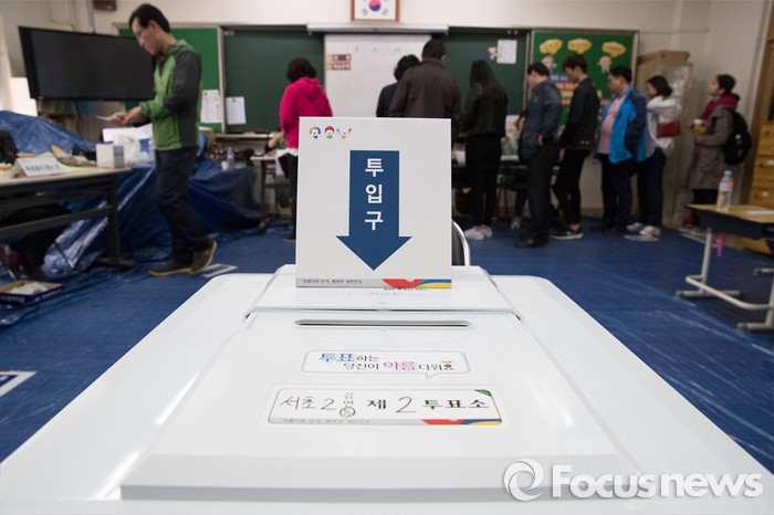 (서울=포커스뉴스) 2016 제20대 국회의원선거날인 13일 오후 서울 서초구 서이초등학교에 마련된 투표소에서 유권자들이 투표를 하고 있다.