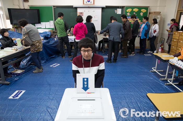 (서울=포커스뉴스) 2016 제20대 국회의원선거날인 13일 오후 서울 서초구 서이초등학교에 마련된 투표소에서 유권자들이 투표를 하기 위해 본인확인을 하고 있다.