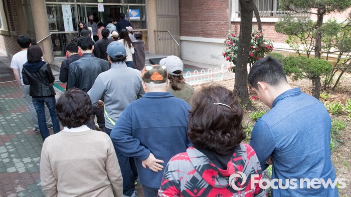 (서울=포커스뉴스) 2016 제20대 국회의원선거날인 13일 오후 서울 서초구 서이초등학교에 마련된 투표소에서 유권자들이 투표를 하기 위해 대기하고 있다.