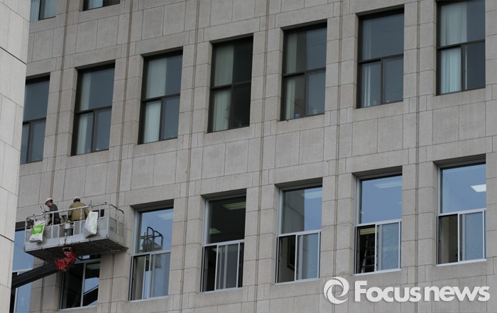 (서울=포커스뉴스) 20대 총선 투표일인 13일 오후 서울 여의도 국회 본청에서 업체 관계자들이 창문교체 작업을 하고 있다.