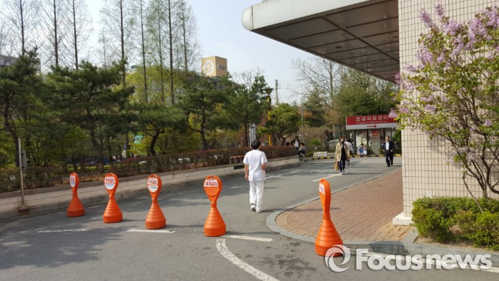 실제 오전까지 강동경희대병원은 응급실로 향하는 차량진입로는 차량용 안전 삼각대로 바리게이트를 쳐 막고, 보행로는 보안요원이 서 접근을 막았다.