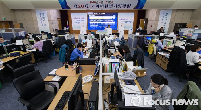 (서울=포커스뉴스) 제20대 국회의원선거일인 13일 오후 경기도 과천 중앙선거관리위원회에 마련된 선거상황실에서 직원들이 분주히 업무를 보고 있다.