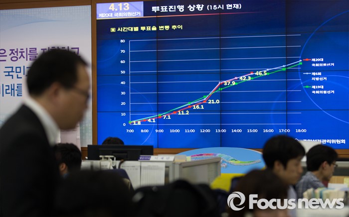 (서울=포커스뉴스) 제20대 국회의원선거일인 13일 오후 경기도 과천 중앙선거관리위원회에 마련된 선거상황실에서 직원들이 분주히 업무를 보고 있다.