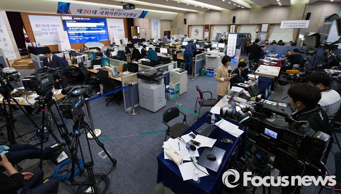 (서울=포커스뉴스) 제20대 국회의원선거일인 13일 오후 경기도 과천 중앙선거관리위원회에 마련된 선거상황실에서 취재진들이 자리 잡고 있다.