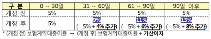 보험금 지급 지연 기간이 0~30일 경우에는 보험계약대출이율(현 5%수준)을 줘야 하며 31~60일 간 지연될 경우 대출이율에 4%포인트를 더욱 가산해 보험금을 지급해야 한다. 61~90일은 6%포인트, 90일 이후 보험금을 지급할 경우 8%포인트의 지연 이자가 붙는다.<자료제공=금융감독원>