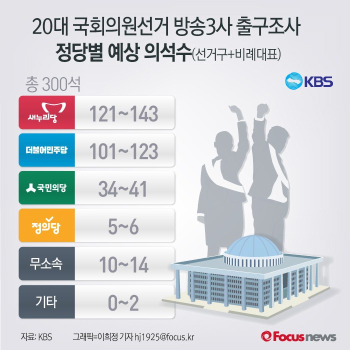 (서울=포커스뉴스) KBS발표 20대 국회의원선거 방송3사 공동 출구조사 정당별 예상 의석수 비교.