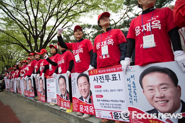 (서울=포커스뉴스) 13일 오후 6시 KBS·MBC·SBS 지상파 방송3사가 공동조사, 발표한 4·13 총선 출구조사 결과에 따르면 대구 달서을에서 새누리당 윤재옥 후보가 65.2%로 당선이 유력한 것으로 나타났다.(대구=포커스뉴스) 새누리당 선거운동원들이 6일 오후 대구광역시 달서구 성당동에서 열린 대구지역 후보자 총집결 거리유세에서 기호 1번 윤재옥 후보의 선거 포스터를 들고 있다. 2016.04.06 김흥구 기자