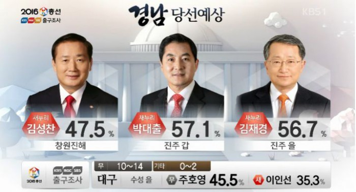 (서울=포커스뉴스)13일 오후 6시 KBS·MBC·SBS 지상파 방송3사가 공동조사, 발표한 4·13 총선 출구조사 결과에 따르면 경남 진주갑 지역구에서는 박대출 새누리당 후보가 57.1%로 당선이 유력한 것으로 나타났다.<사진출처=KBS 출구방송 화면캡쳐>