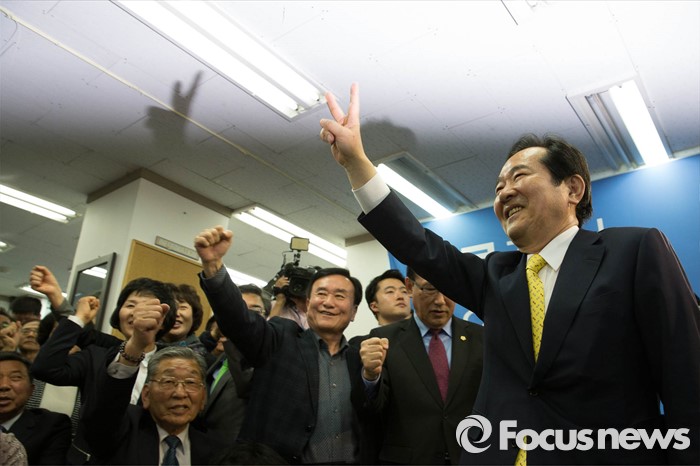 (서울=포커스뉴스) 제20대 국회의원선거일인 13일 오후 서울 종로구 정세균 더불어민주당 종로구 후보의 사무실에서 지지자들이 환호하고 있다.