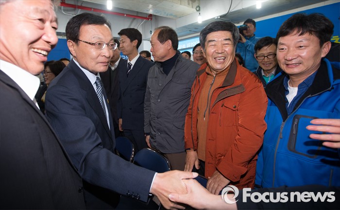 (세종=포커스뉴스) 제20대 국회의원선거가 마감된 가운데 이해찬 무소속 후보가 13일 오후 세종시 도담동 선거사무소에서 방송3사 출구조사 결과 앞서는 것으로 나타나자 지지자들과 악수를 하며 선거사무소를 나서고 있다.