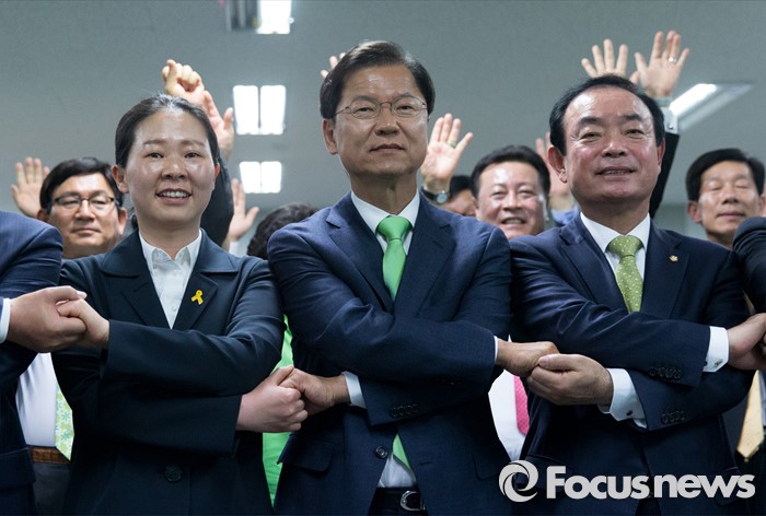 (광주=포커스뉴스) 제20대 국회의원 선거일인 13일 오후 광주 서구 국민의당 광주광역시당에서 천정배(가운데) 국민의당 공동대표와 권은희(왼쪽) 국민의당 광산구을 후보, 장병완 동구남구 갑 후보가 기념촬영을 하고 있다.