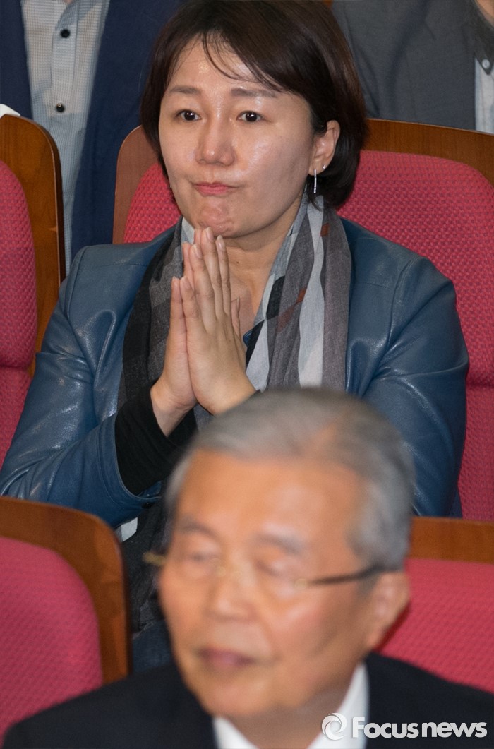 (서울=포커스뉴스) 20대 총선 투표일인 13일 오후 서울 여의도 국회 의원회관 대회의실에 마련된 더불어민주당 개표상황실에서 이재정 비례대표 후보가 두 손을 모은 채 출구조사 및 개표방송을 시청하고 있다. 앞쪽은 김종인 비대위 대표 겸 선대위원장.
