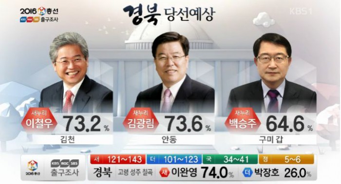 (서울=포커스뉴스)13일 오후 6시 KBS·MBC·SBS 지상파 방송3사가 공동조사, 발표한 4·13 총선 출구조사 결과에 따르면 경북 김천 지역구에서는 이철우 새누리당 후보가 73.2%로 당선이 유력한 것으로 나타났다.<사진출처=KBS 출구방송 화면캡쳐>