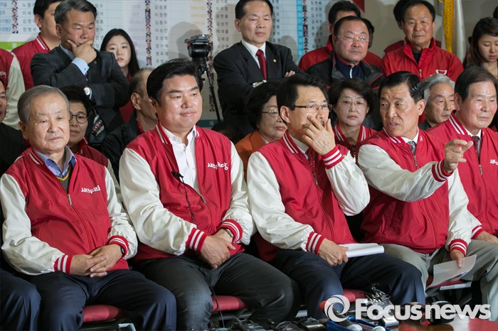 (서울=포커스뉴스) 제20대 국회의원 선거날인 13일 오후 서울 여의도 새누리당사에서 원유철(왼쪽 두번째) 원내대표와 강봉균(왼쪽) 공동선대위원장, 이군현(가운데) 공동총괄본부장이 방송 3사의 출구조사를 시청하고 있다. 오른쪽 두번째는 황진하 사무총장.