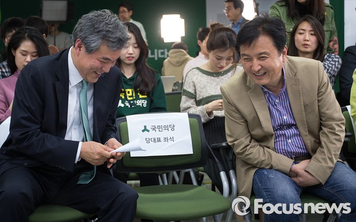 (서울=포커스뉴스) 김영환 국민의당 안산시상록구을 국회의원 후보와 이상돈 비례대표가 13일 오후 서울 마포구 당사 개표상황실에서 웃고 있다.
