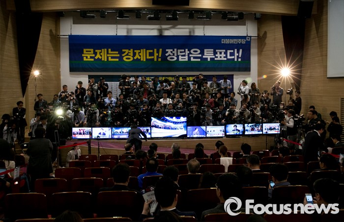 (서울=포커스뉴스) 20대 총선 투표일인 13일 오후 서울 여의도 국회 의원회관 대회의실에 마련된 더불어민주당 개표상황실에서 취재진이 김종인 비대위 대표 겸 선대위원장 등 선대위원들의 출구조사 및 개표방송을 시청하는 모습을 취재하고 있다.