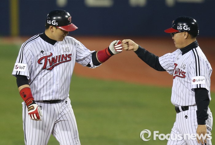 (서울=포커스뉴스) 13일 서울 잠실구장에서 열린 2016 프로야구 롯데-LG 경기 2회말 1사 1,2루에서 LG 정상호가 2루주자를 불러 들이는 좌전안타를 치고 1루에서 한혁수 코치와 주먹을 마주치고 있다.
