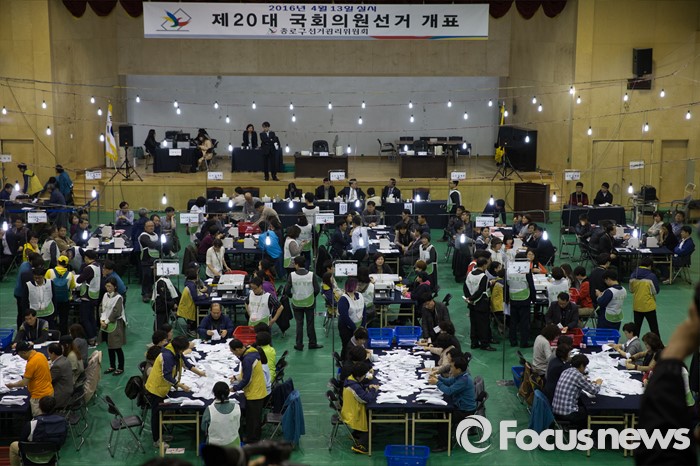 (서울=포커스뉴스) 제20대 국회의원선거일인 13일 오후 서울 종로구 경기상업고등학교 체육관에 마련된 개표소에서 종로구 선거관리위원회 관계자들이 개표하고 있다.
