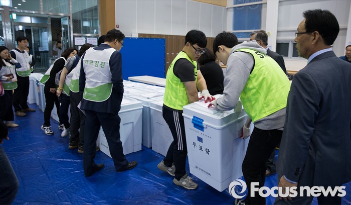 (서울=포커스뉴스) 제20대 국회의원선거일인 13일 오후 서울 은평다목적체육관에 마련된 개표소에서 은평구 선거관리위원회 관계자들이 투표함을 옮기고 있다.