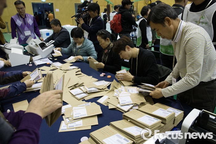 (서울=포커스뉴스) 제20대 국회의원선거일인 13일 오후 서울 종로구 경기상업고등학교 체육관에 마련된 개표소에서 종로구 선거관리위원회 관계자들이 관외사전투표용지를 확인하고 있다.