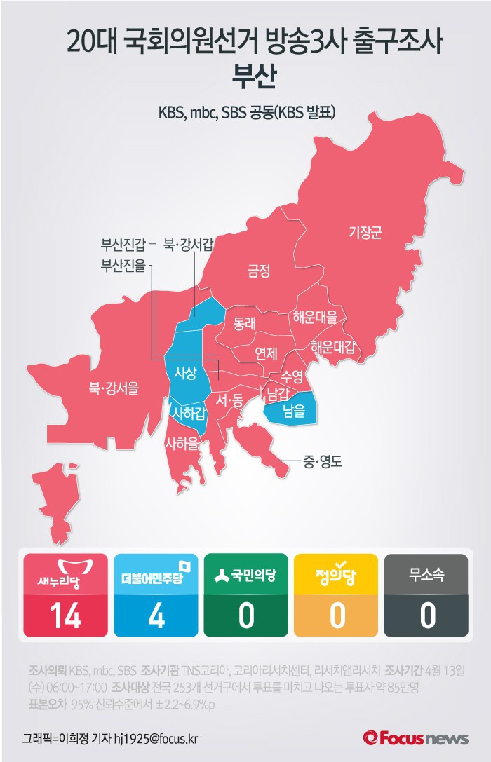(서울=포커스뉴스) KBS·mbc·SBS 지상파 방송 3사 공동 출구조사 결과 부산에서 새누리당은14곳, 더불어민주당이 4곳에서 우세를 예측했다.