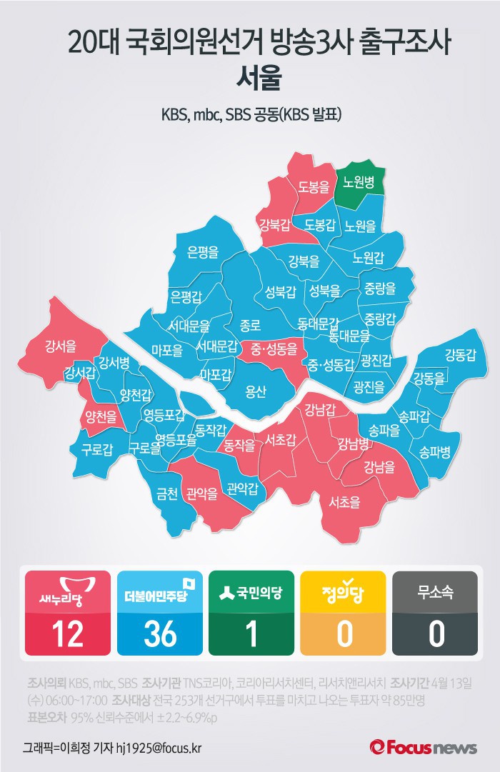 (서울=포커스뉴스) KBS·mbc·SBS 지상파 방송 3사 공동 출구조사 결과 서울에서 새누리당은 12곳, 더불어민주당 36곳, 국민의당은 1곳에서 우세를 예측했다.