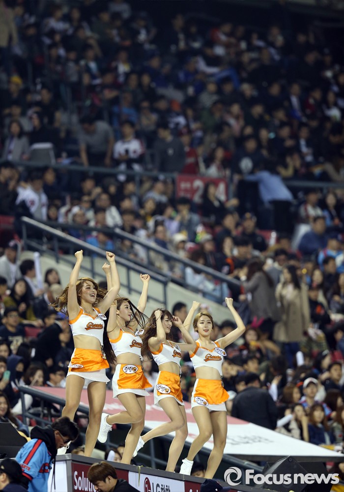 (서울=포커스뉴스) 20대 국회의원 선거일인 13일 서울 잠실구장에서 열린 2016 프로야구 롯데-LG 경기를 찾은 많은 야구팬들에게 치어리더가 응원의 열기를 북돋우고 있다.