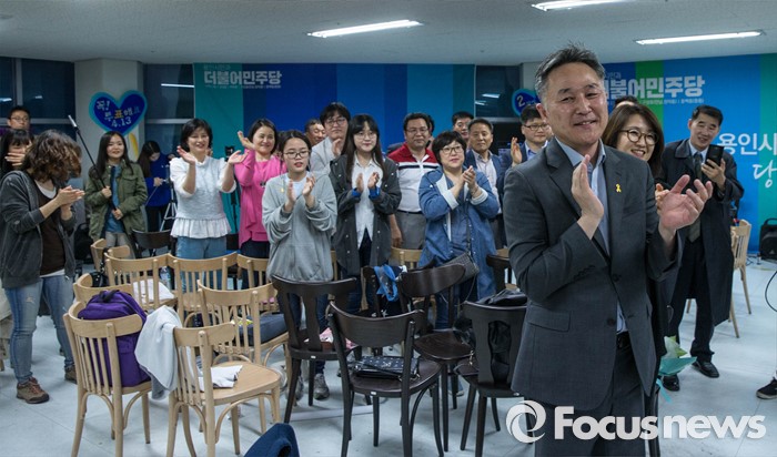 (용인=포커스뉴스) 제20대 국회의원 선거날인 13일 오후 경기도 용인시 기흥에 위치한 선거사무실에서 표창원 더불어민주당 용인정 후보가 '당선유력' 이라는 방송사 개표 상황을 확인하고 지지자들의 축하를 받고 있다.