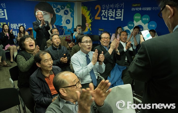 (서울=포커스뉴스) 2016 제20대 국회의원선거날인 13일 오후 서울 강남구 로즈데일빌딩에 위치한 전현희 더불어민주당 강남을 후보 선거사무소에서 지지자들이 개표장에서 들려오는 소식에 기뻐하고 있다.
