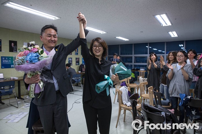 | △ 당선이 유력한 표창원 후보 '부인 손을 번쩍!' |