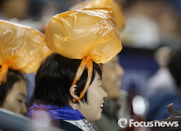 (서울=포커스뉴스) 제 20대 국회의원 선거일인 13일 서울 잠실구장에서 열린 2016 프로야구 롯데-LG 경기를 찾은 한 야구팬이 머리 위에 공기 한 봉지를 쓰고 야구 경기를 즐기고 있다.